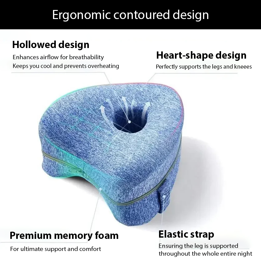 This ergonomic leg pillow is crafted to enhance your sleep quality and relieve pain. Its innovative hollow center promotes cooling airflow, while the heart-shaped contour ensures precise support for your legs and knees. Made with premium memory foam and a secure elastic strap, this pillow stays in place all night, allowing you to enjoy uninterrupted comfort.
